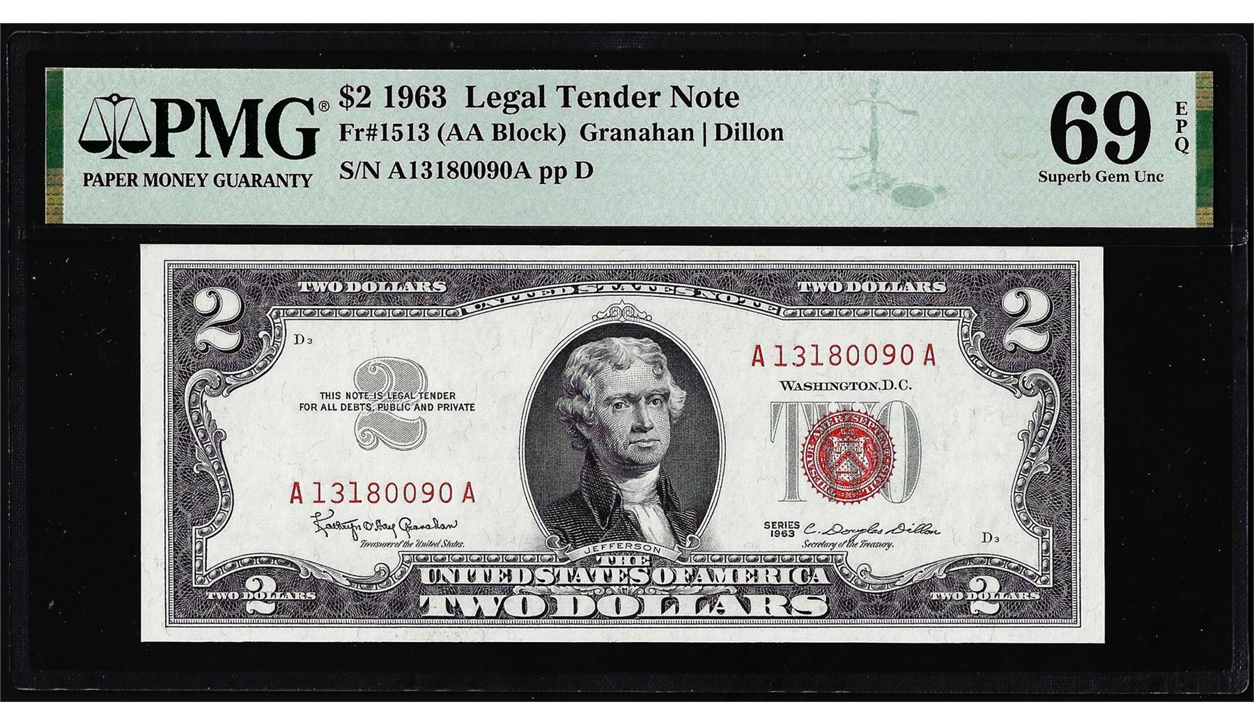 One 1963 $2 Legal Tender Note Fr.1513 PMG Superb Gem Uncirculated 69EPQ. PMG Certified.