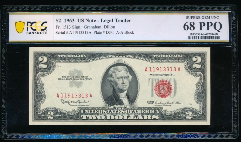 One 1963 $2 Legal Tender Note PCGS 68PPQ.