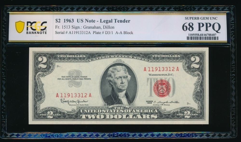 One 1963 $2 Legal Tender Note PCGS 68PPQ.