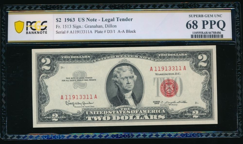 One 1963 $2 Legal Tender Note PCGS 68PPQ.