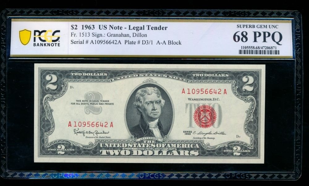 One 1963 $2 Legal Tender Note PCGS 68PPQ.