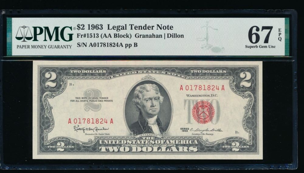 One 1963 $2 Legal Tender Note PMG 67EPQ.