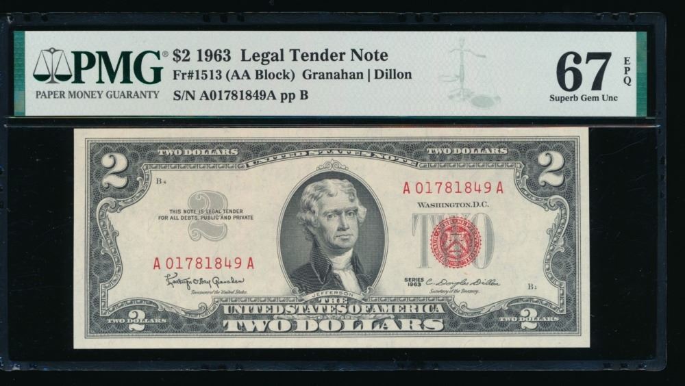 One 1963 $2 Legal Tender Note PMG 67EPQ.