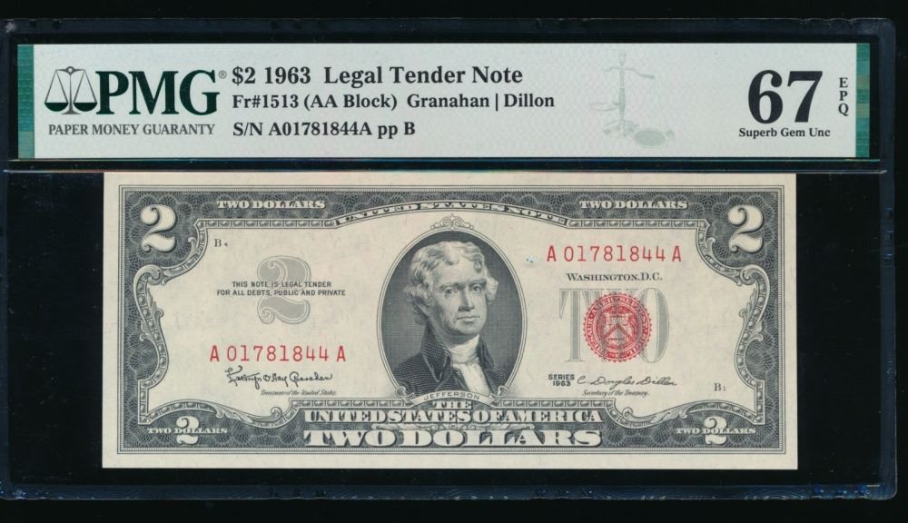 One 1963 $2 Legal Tender Note PMG 67EPQ.