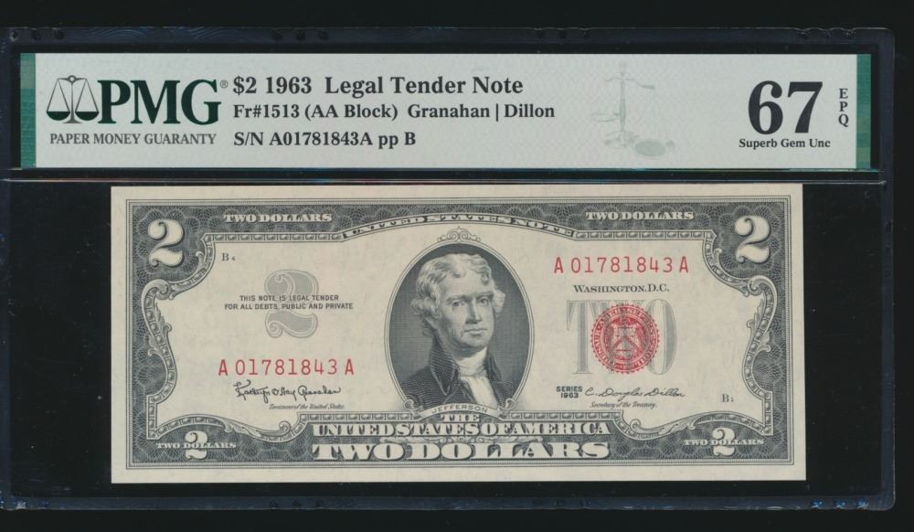 One 1963 $2 Legal Tender Note PMG 67EPQ.