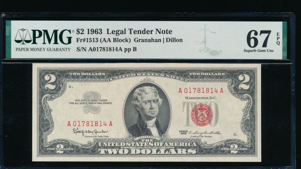 One 1963 $2 Legal Tender Note PMG 67EPQ.