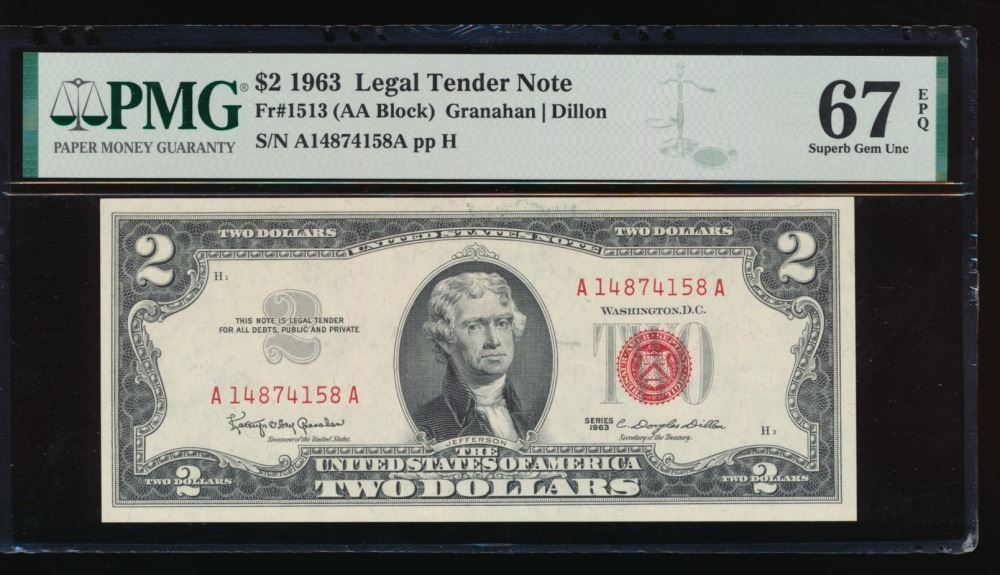 One 1963 $2 Legal Tender Note PMG 67EPQ.