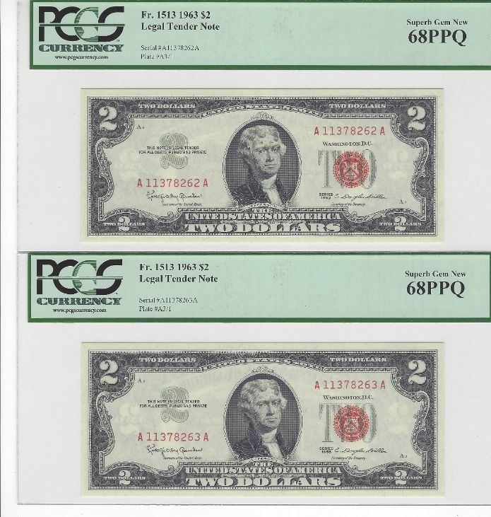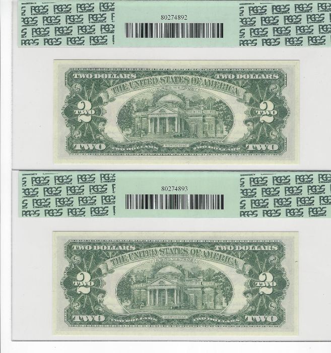 What an excellent graded set of 5 consecutive $2 Legal Tender notes. These are the highest graded notes in this series. Nothing tops this set. You will not find another set like this on the planet. These notes boast 1 graded on 69 PPQ Superb Gem New. Then there are 4 consecutive notes graded in 68 PPQ Superb Gem New. The notes are perfectly centered and the embossing and ink pops off the notes. The notes look like they were just printed yesterday.