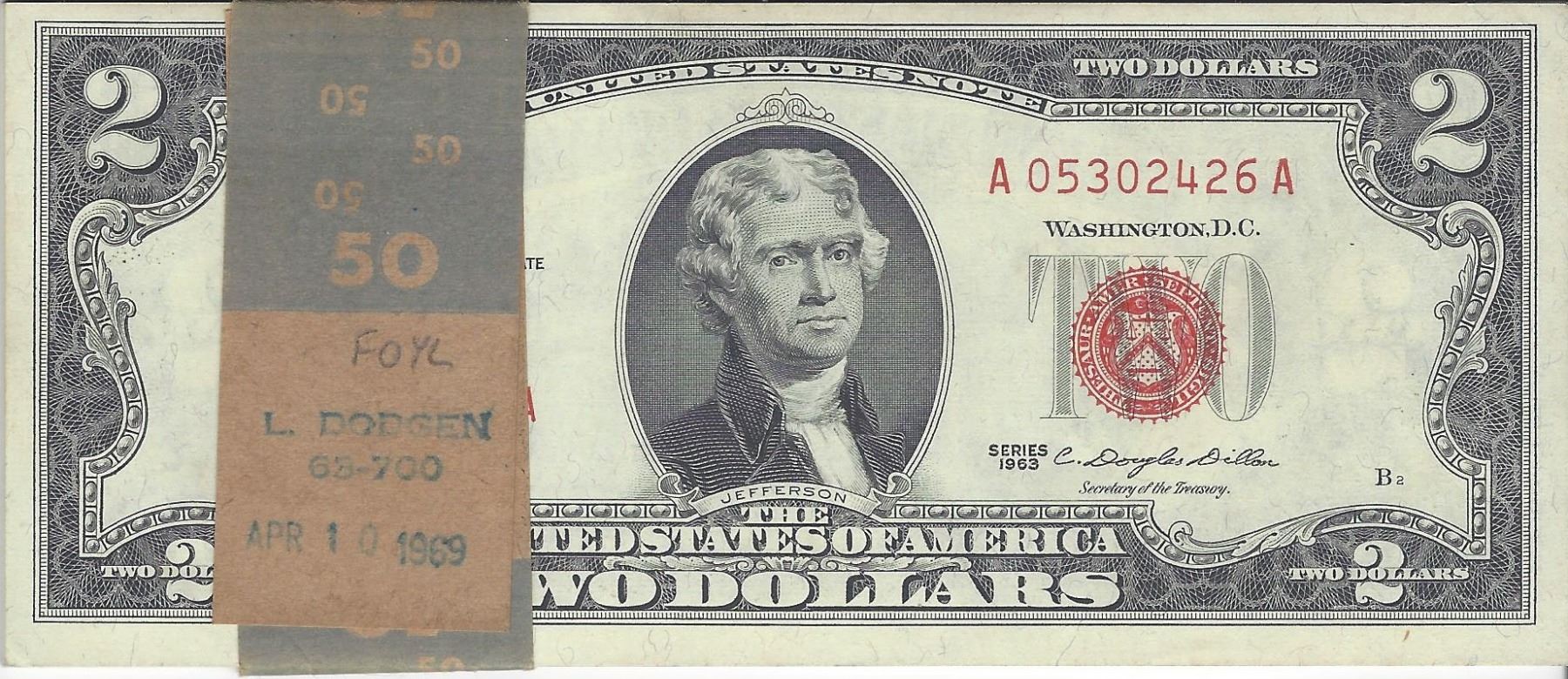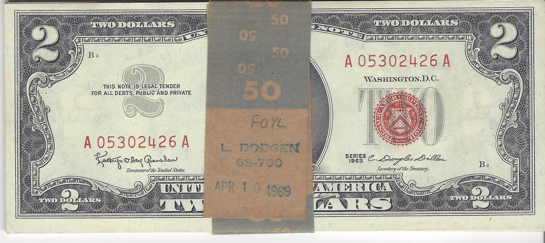 Rare $2 quarter pack of 1963 Legal Tender notes. Excellent centering on this quarter pack. The notes are all Gem CU.