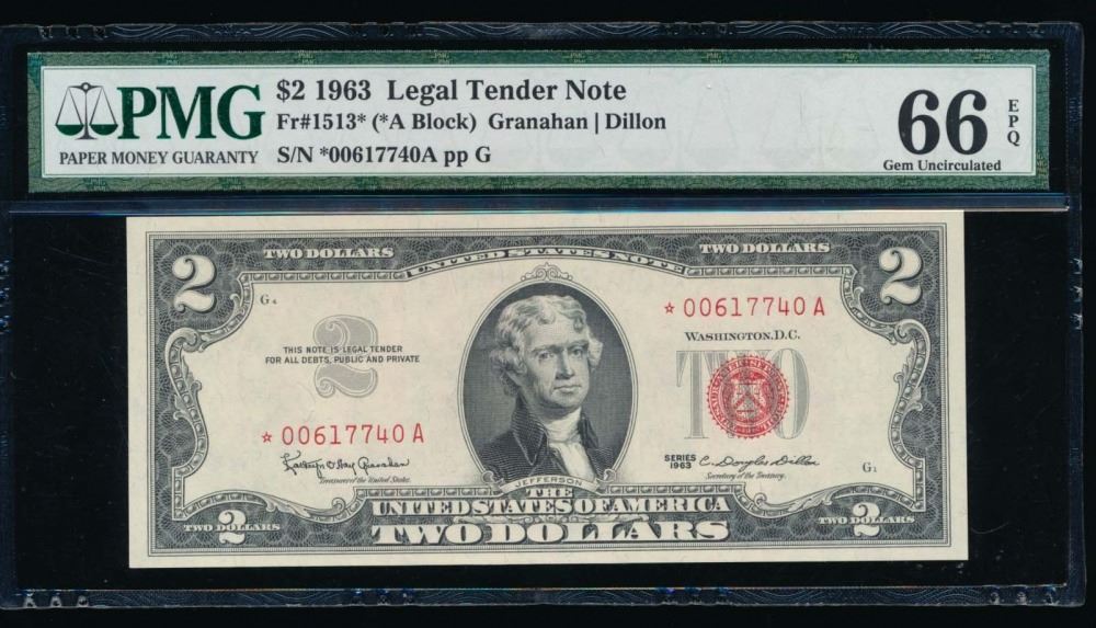 One 1963 $2 Legal Tender STAR Note PMG 66EPQ.