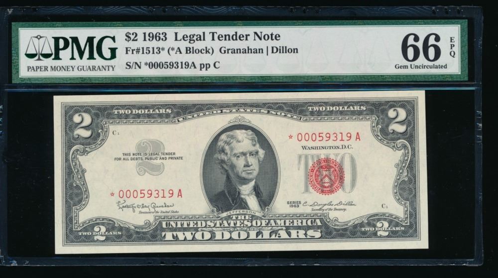 One 1963 $2 Legal Tender STAR Note PMG 66EPQ.
