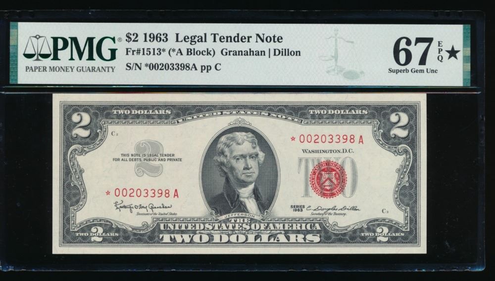 One 1963 $2 Legal Tender STAR Note PMG 67EPQ.