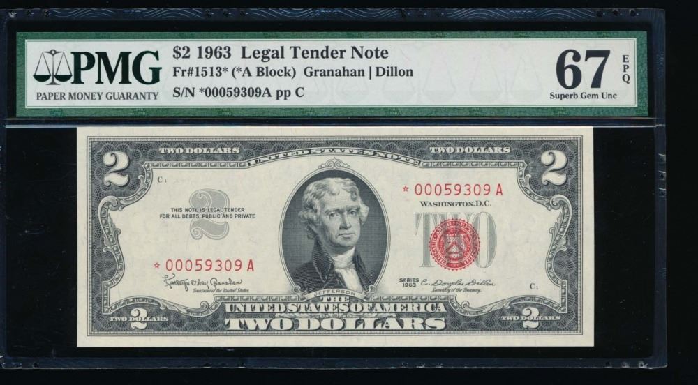 One 1963 $2 Legal Tender Star Note PMG 67EPQ.