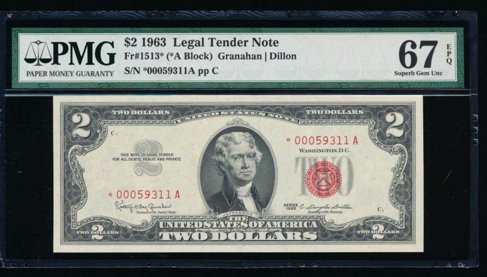 One 1963 $2 Legal Tender Star Note PMG 67EPQ.