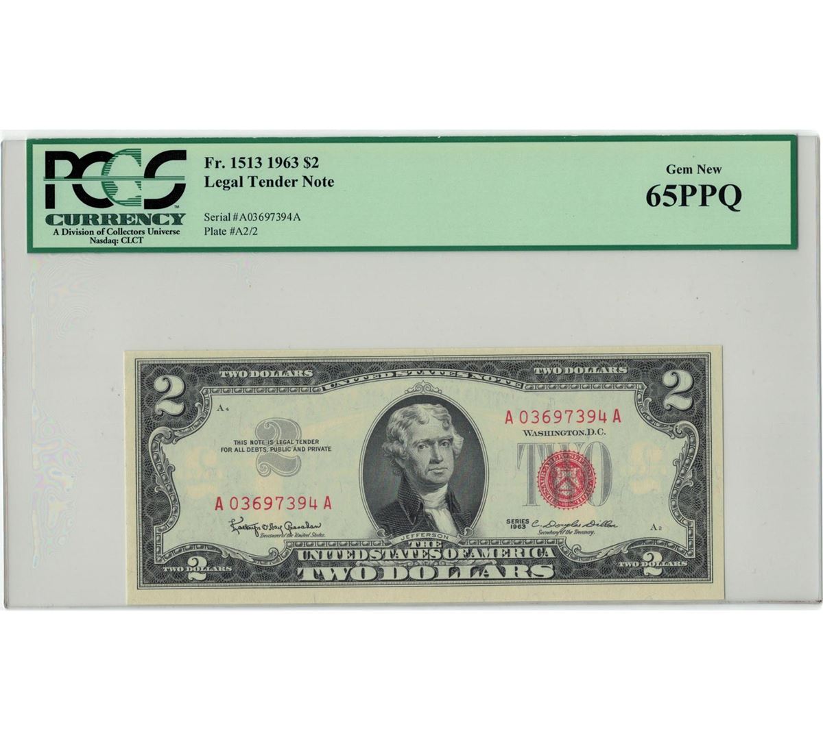 1963 $2 PCGS Gem New 65PPQ Legal Tender Note. PCGS Certified.
