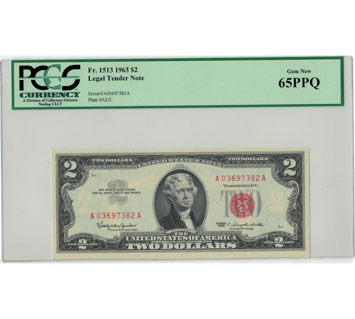 1963 $2 PCGS Gem New 65PPQ Legal Tender Note. PCGS Certified.