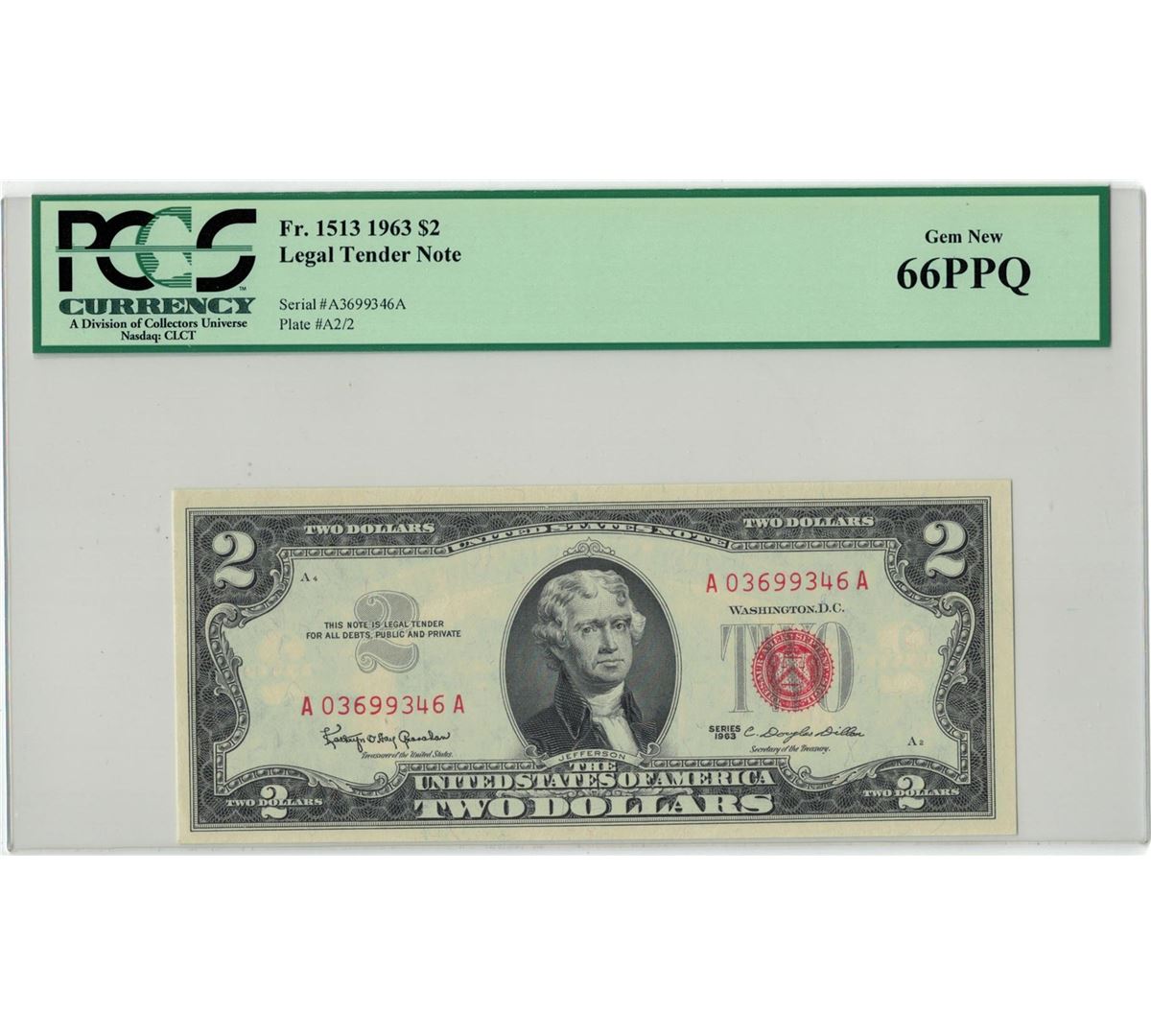 1963 $2 PCGS Gem New 66PPQ Legal Tender Note. PCGS Certified.
