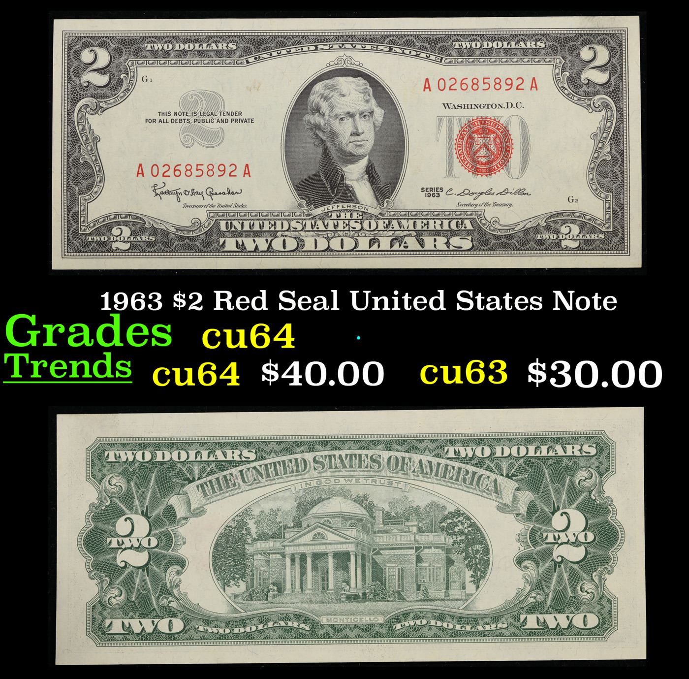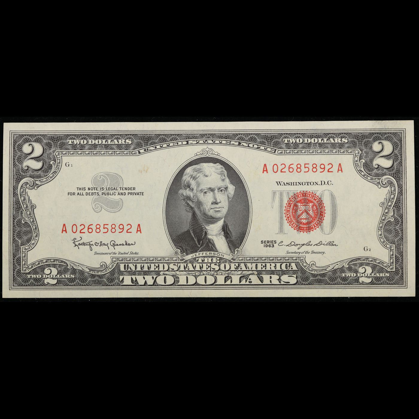 1963 $2 Red Seal United States Note Grades Choice CU. On April 13, 1976, to celebrate the bicentennial of American independence, new $2 Federal Reserve Notes were issued with backs featuring the well-known painting Signing of the Declaration of Independence. These Notes all have a 13c Stamp or 2 stamps totaling 13c hand canceled on April 13, 1976 for the first day of issue of the new $2 notes. These official first-day-of-issue Bicentennial notes will be historic additions to your collection (designs and locations of the 13¢ stamps will vary).