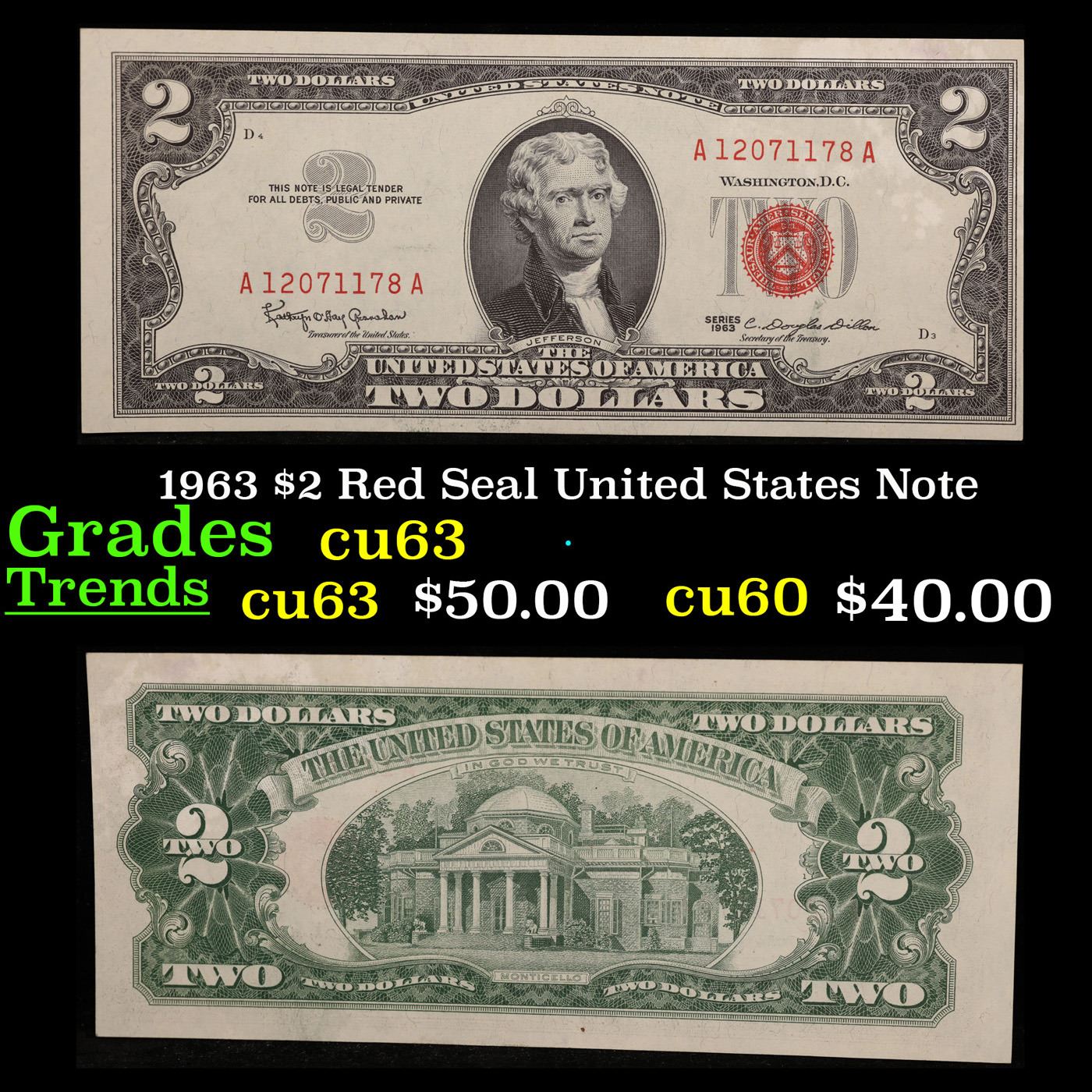 1963 $2 Red Seal United States Note Grades Select CU. 1963 Legal Tender (United States Note). 1963 marks the last year that red seals were printed on two dollar bills. This is also the last year that Monticello was used on the back of two dollar bills. All two dollar bills from 1963 have a red seal on the right hand side of the bank note.