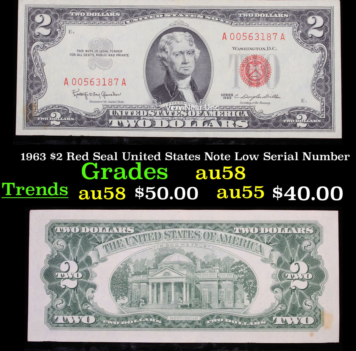 1963 $2 Red Seal United States Note Low Serial Number Grades Choice AU/BU Slider.