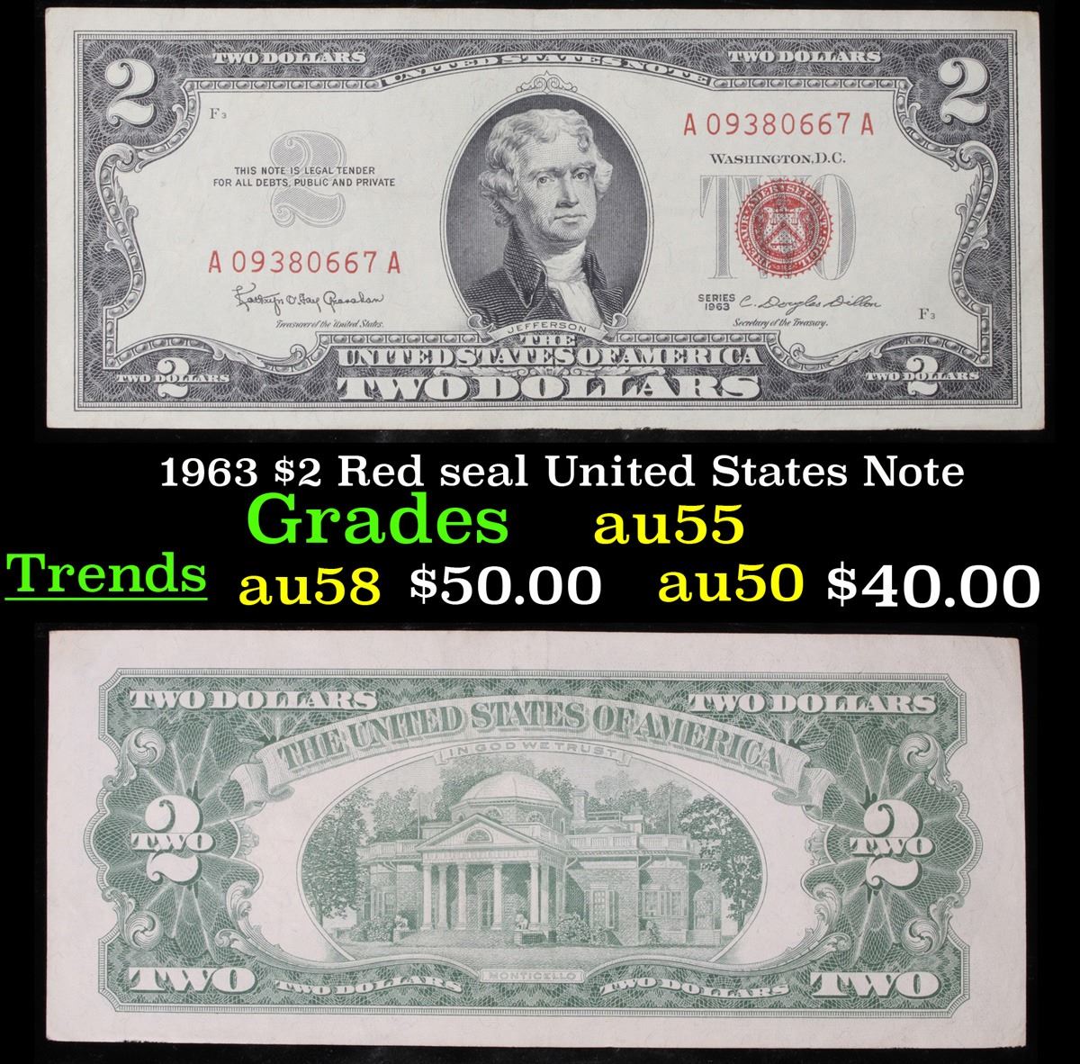 1963 $2 Red seal United States Note Grades Choice AU. 1963 Legal Tender (United States Note). 1963 marks the last year that red seals were printed on two dollar bills. This is also the last year that Monticello was used on the back of two dollar bills. All two dollar bills from 1963 have a red seal on the right hand side of the bank note.