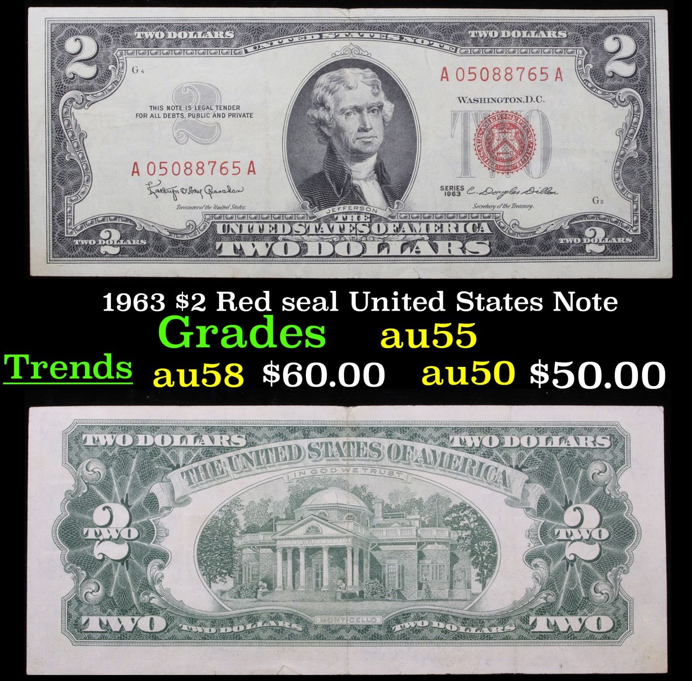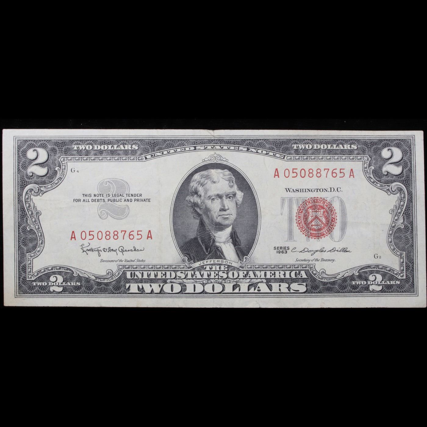 1963 $2 Red seal United States Note Grades Choice AU. 1953 red print two dollar bills can be broken up into four different types by signature combination. This bill has signatures Priest/Humphrey1953 two dollar bills feature Thomas Jefferson as the central figure. The back of the bill shows Monticello. These were printed in Washington DC and circulated across the country. They have red overprints and a red seal on the right hand side of the bill. You can find the following phrases on the bill, “Two Dollars, United States Note, The United States of America will pay to the bearer on demand Two Dollars” “This note is a legal tender at its face value for all debts public and private”