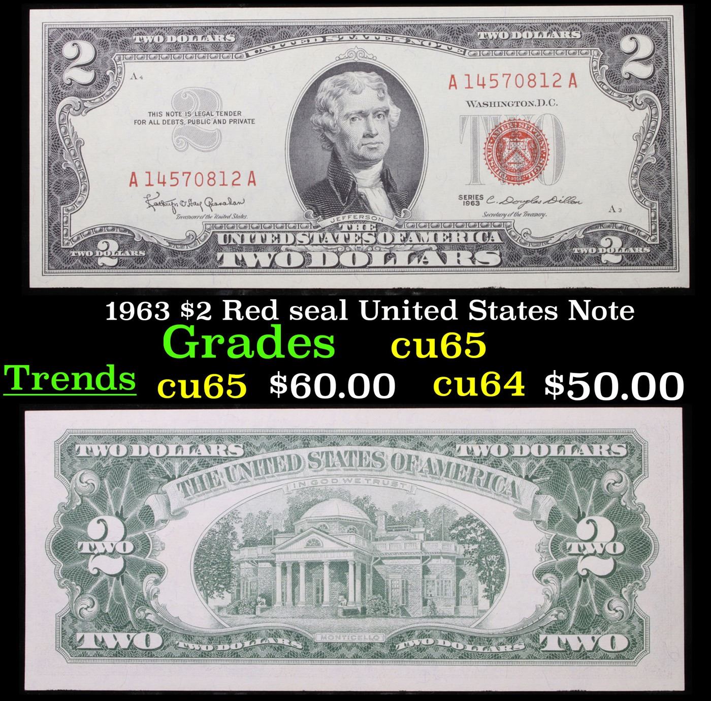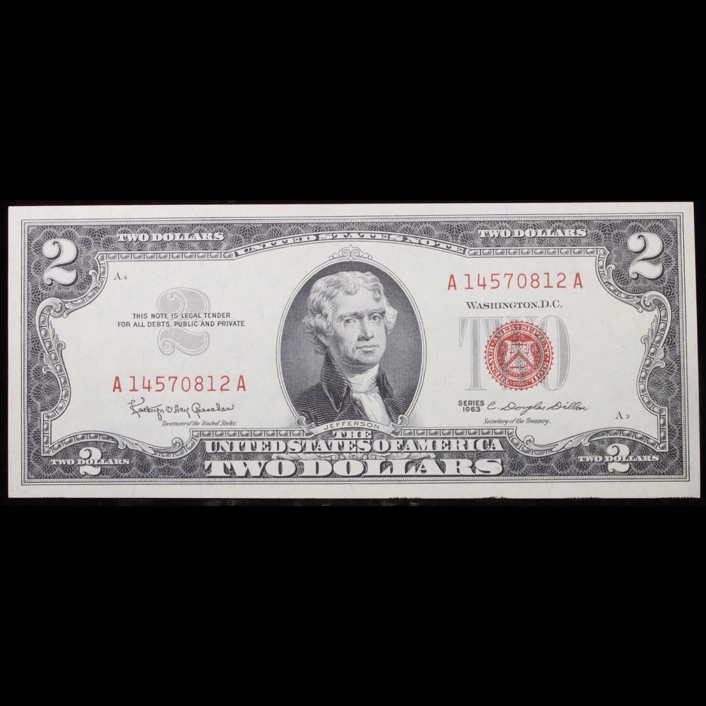 1963 $2 Red seal United States Note Grades Gem CU. 1963 Legal Tender (United States Note). 1963 marks the last year that red seals were printed on two dollar bills. This is also the last year that Monticello was used on the back of two dollar bills. All two dollar bills from 1963 have a red seal on the right hand side of the bank note.
