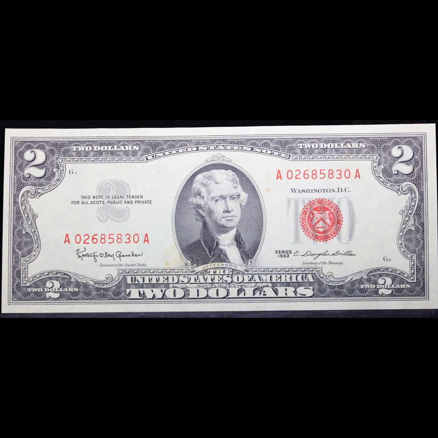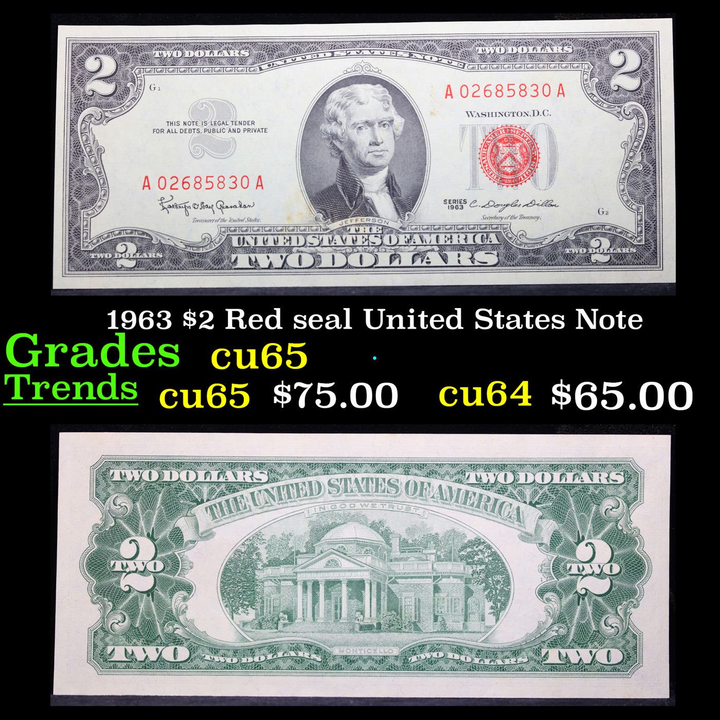 1963 $2 Red seal United States Note Grades Gem CU. 1963 Legal Tender (United States Note). 1963 marks the last year that red seals were printed on two dollar bills. This is also the last year that Monticello was used on the back of two dollar bills. All two dollar bills from 1963 have a red seal on the right hand side of the bank note.