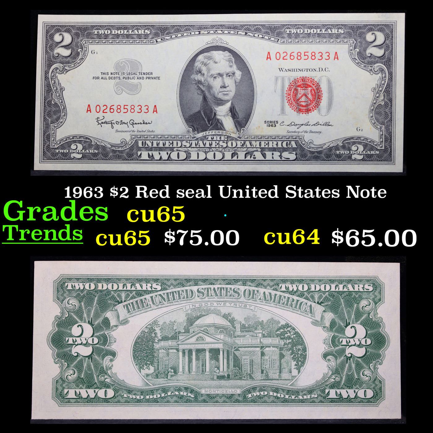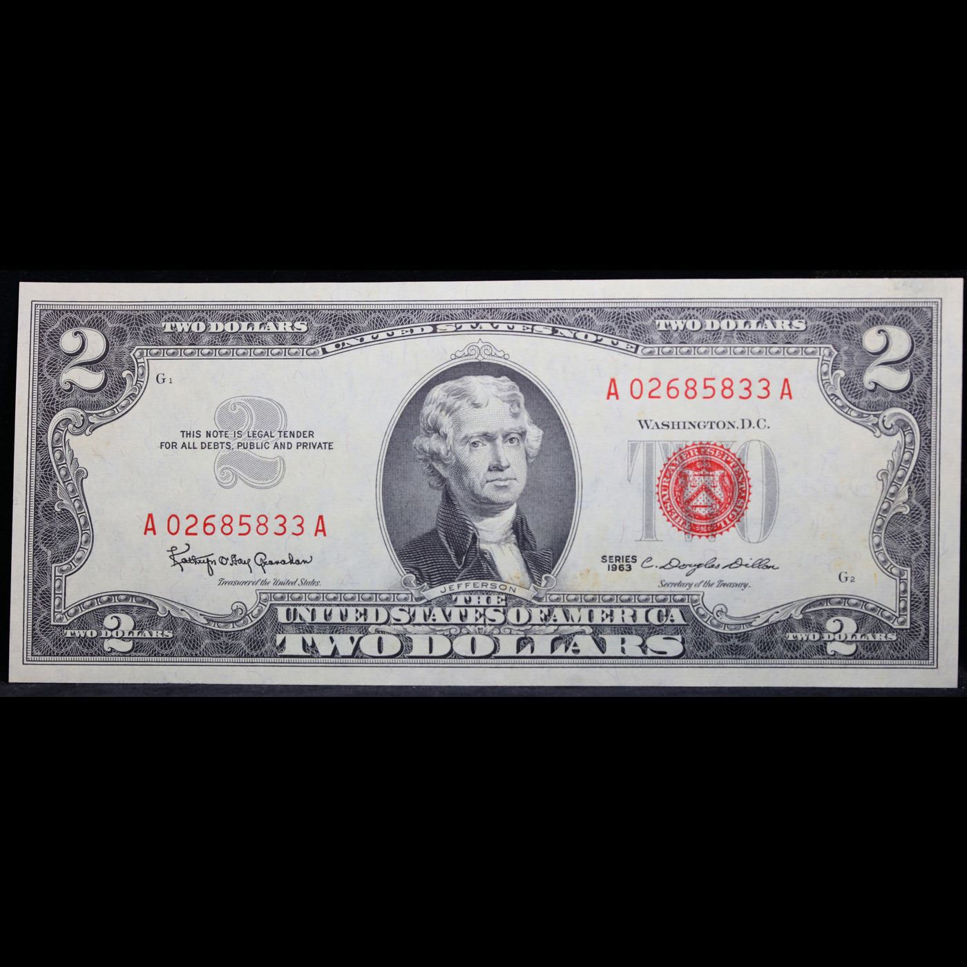 1963 $2 Red seal United States Note Grades Gem CU. 1963 Legal Tender (United States Note). 1963 marks the last year that red seals were printed on two dollar bills. This is also the last year that Monticello was used on the back of two dollar bills. All two dollar bills from 1963 have a red seal on the right hand side of the bank note.