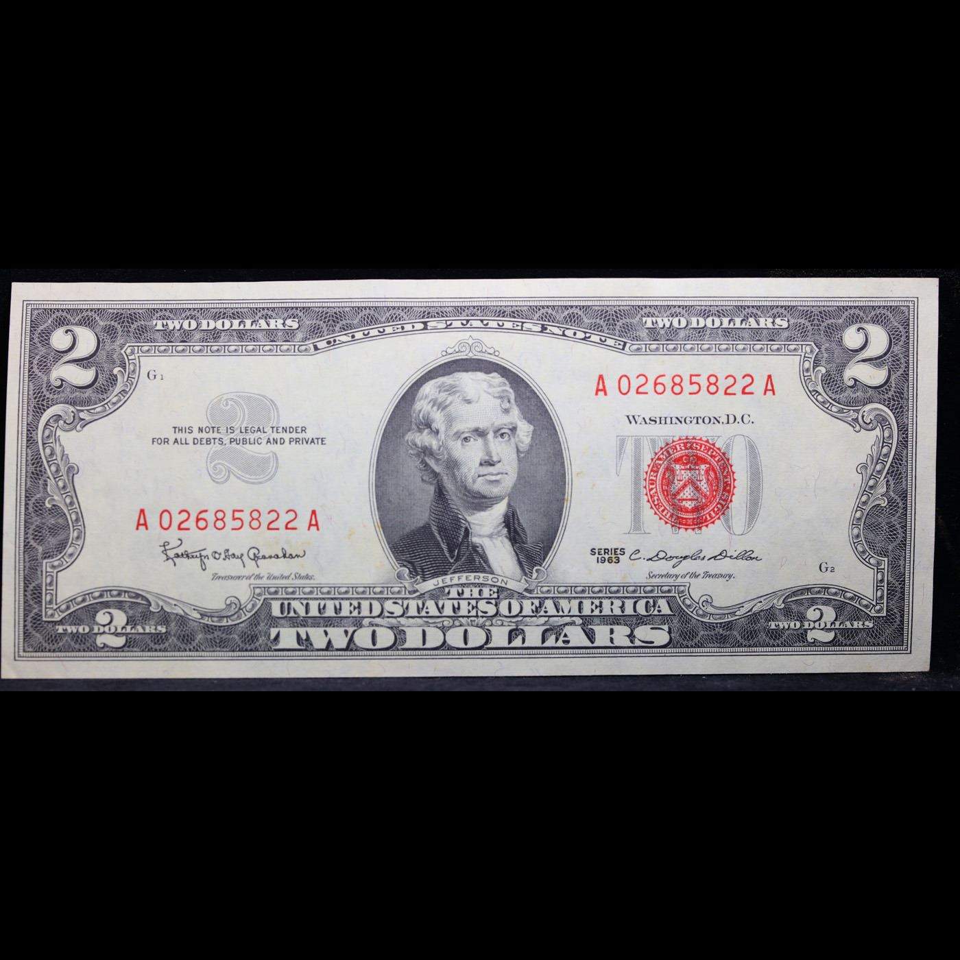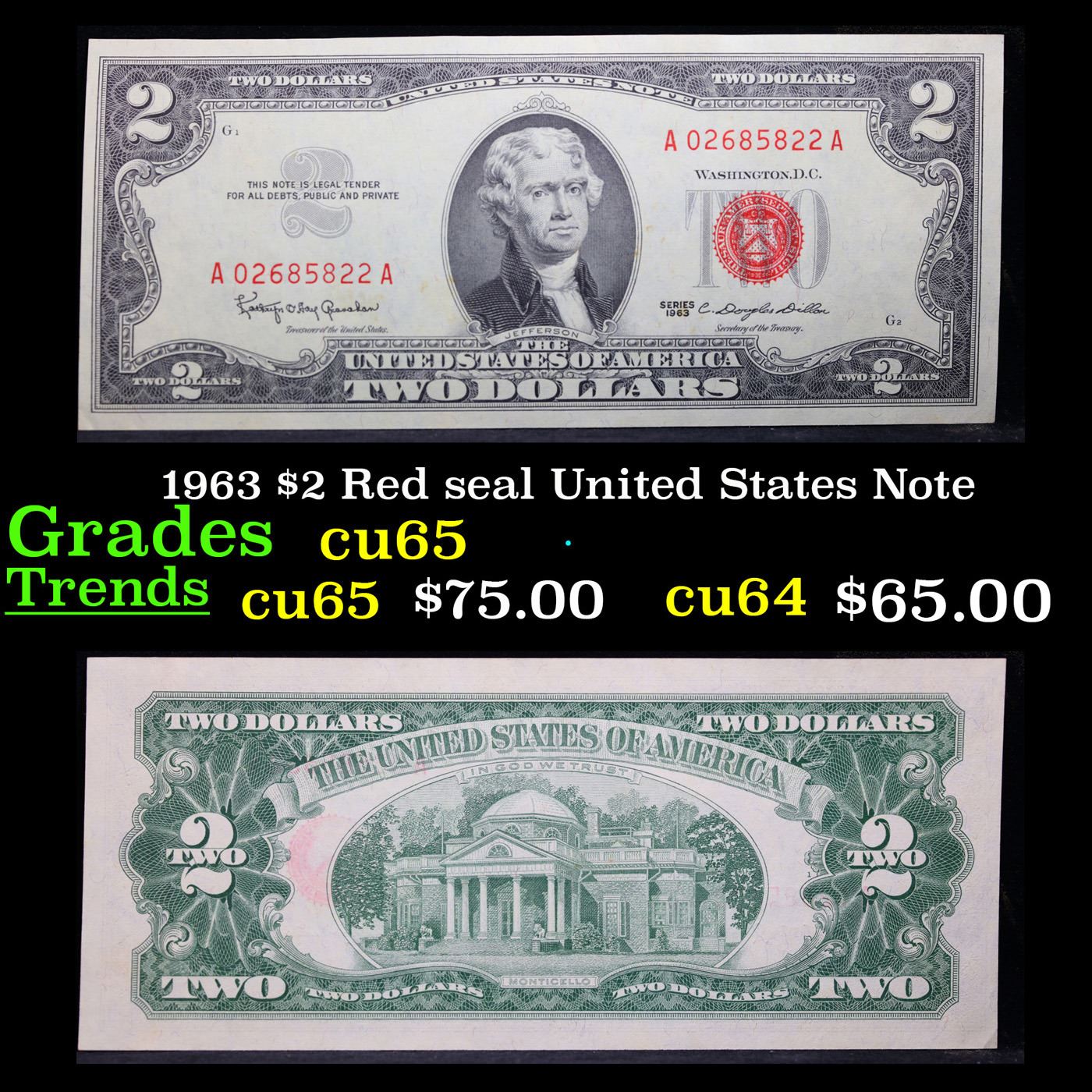 1963 $2 Red seal United States Note Grades Gem CU. 1963 Legal Tender (United States Note). 1963 marks the last year that red seals were printed on two dollar bills. This is also the last year that Monticello was used on the back of two dollar bills. All two dollar bills from 1963 have a red seal on the right hand side of the bank note.
