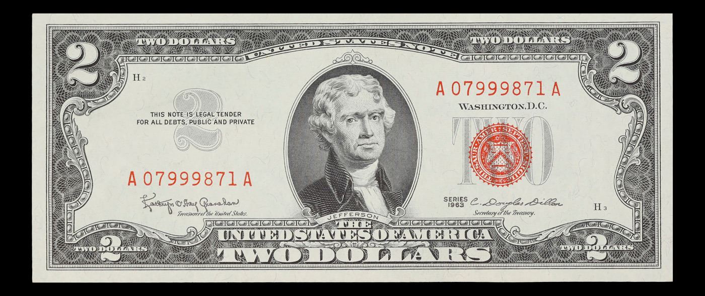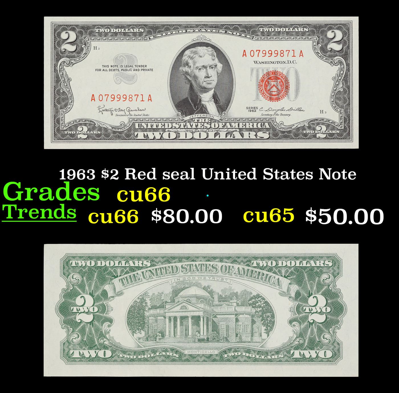 1963 $2 Red seal United States Note Grades Gem+ CU. 1963 Legal Tender (United States Note). 1963 marks the last year that red seals were printed on two dollar bills. This is also the last year that Monticello was used on the back of two dollar bills. All two dollar bills from 1963 have a red seal on the right hand side of the bank note.