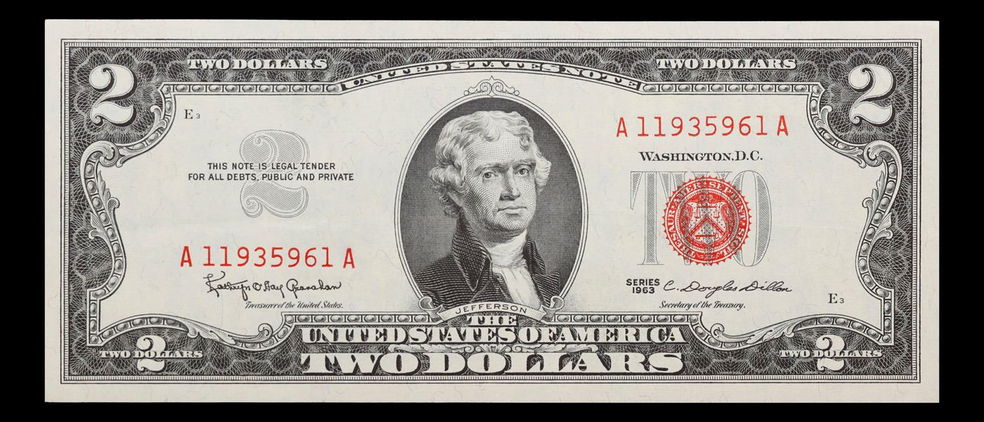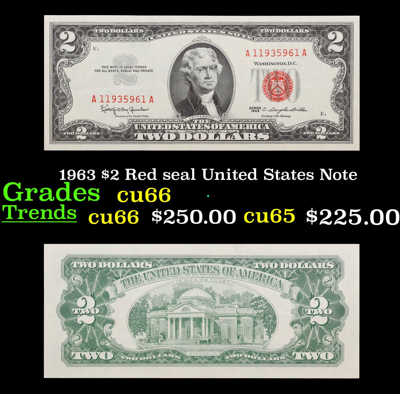 1963 $2 Red seal United States Note Grades Gem+ CU. 1963 Legal Tender (United States Note). 1963 marks the last year that red seals were printed on two dollar bills. This is also the last year that Monticello was used on the back of two dollar bills. All two dollar bills from 1963 have a red seal on the right hand side of the bank note.