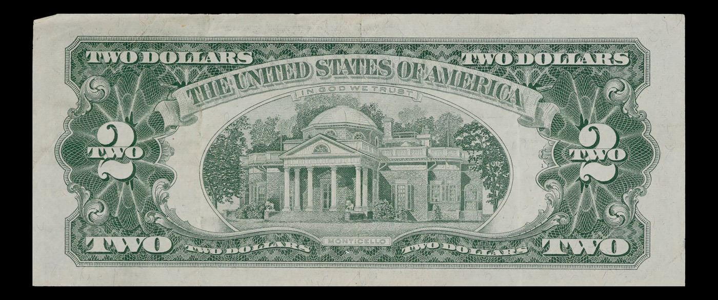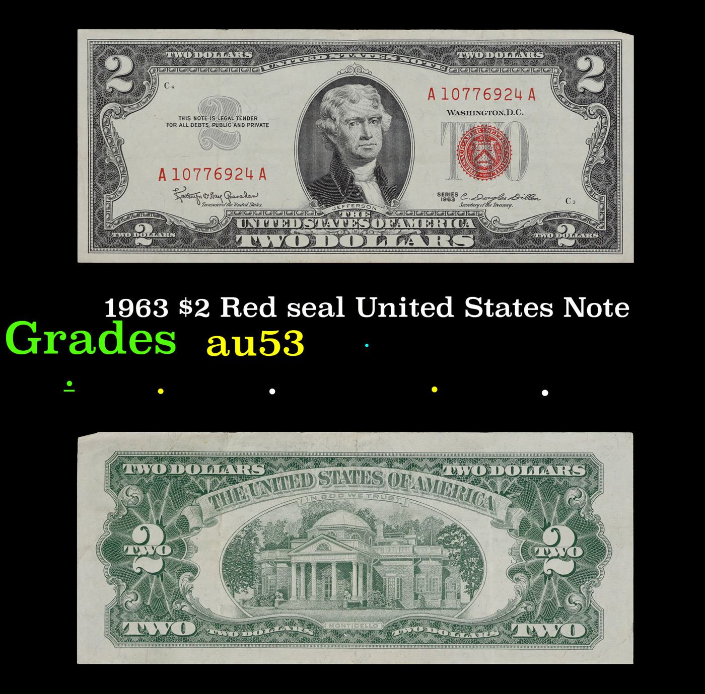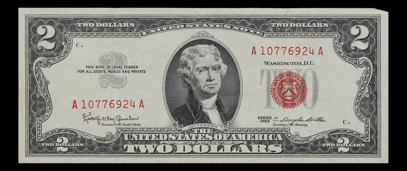1963 $2 Red seal United States Note Grades Select AU. 1963 Legal Tender (United States Note). 1963 marks the last year that red seals were printed on two dollar bills. This is also the last year that Monticello was used on the back of two dollar bills. All two dollar bills from 1963 have a red seal on the right hand side of the bank note.