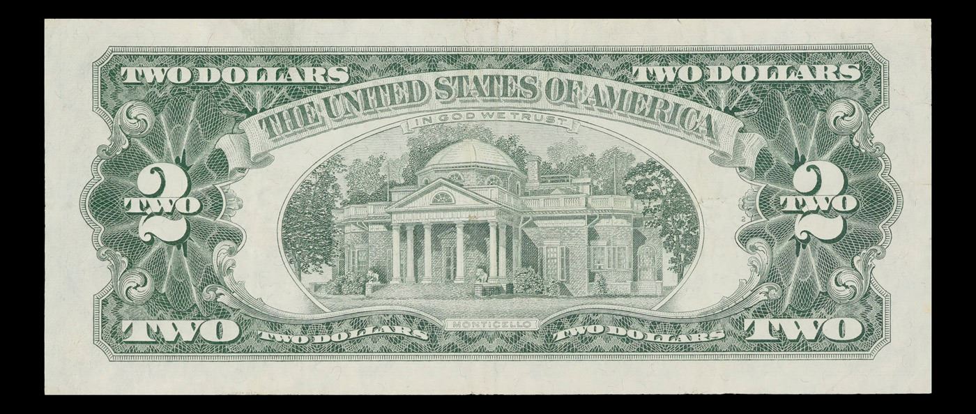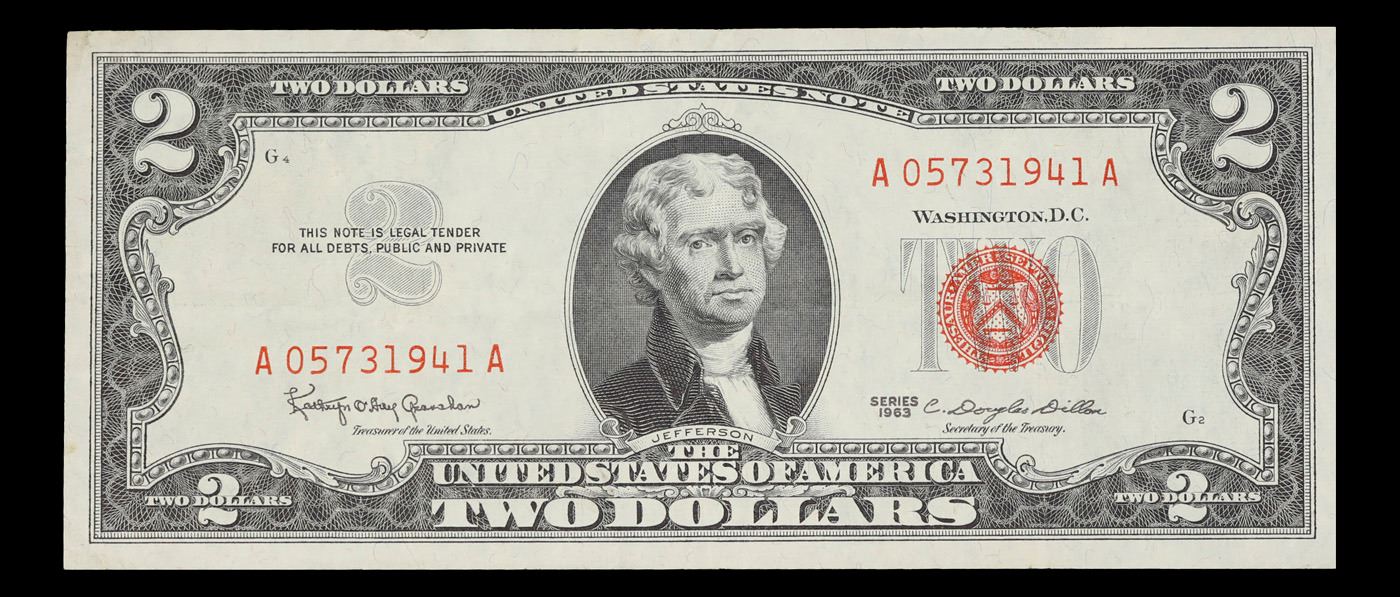 1963 $2 Red seal United States Note Grades Select AU. 1963 Legal Tender (United States Note). 1963 marks the last year that red seals were printed on two dollar bills. This is also the last year that Monticello was used on the back of two dollar bills. All two dollar bills from 1963 have a red seal on the right hand side of the bank note.