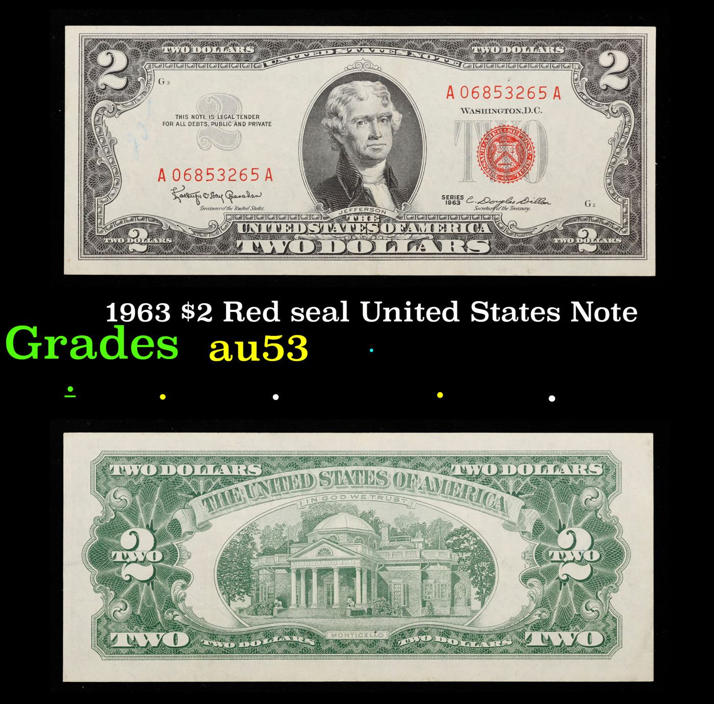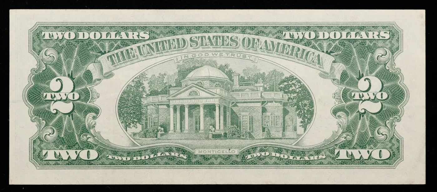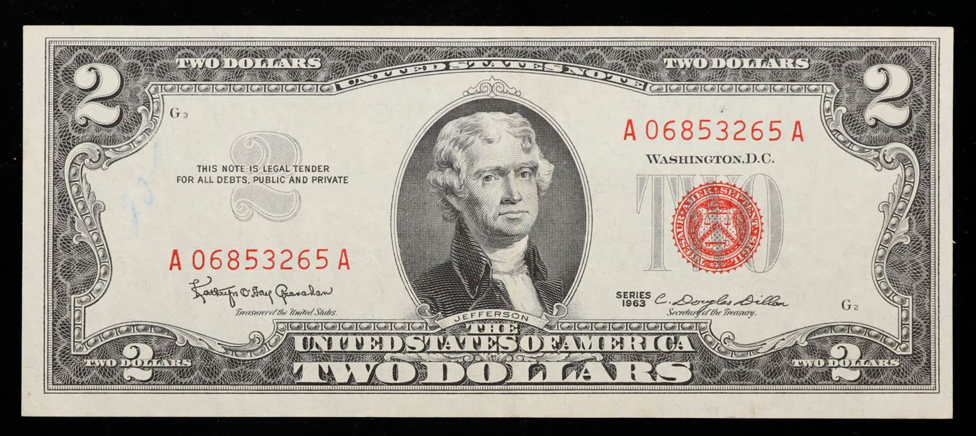 1963 $2 Red seal United States Note Grades Select AU. 1963 Legal Tender (United States Note). 1963 marks the last year that red seals were printed on two dollar bills. This is also the last year that Monticello was used on the back of two dollar bills. All two dollar bills from 1963 have a red seal on the right hand side of the bank note.