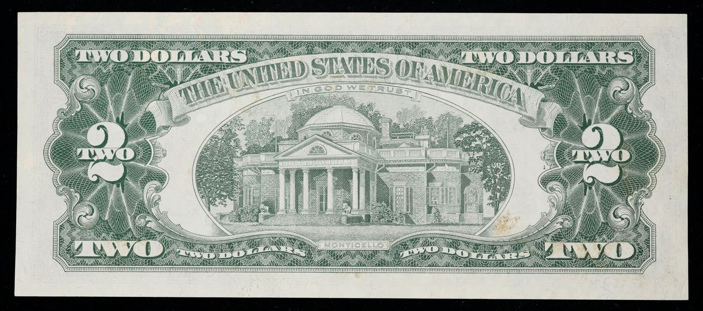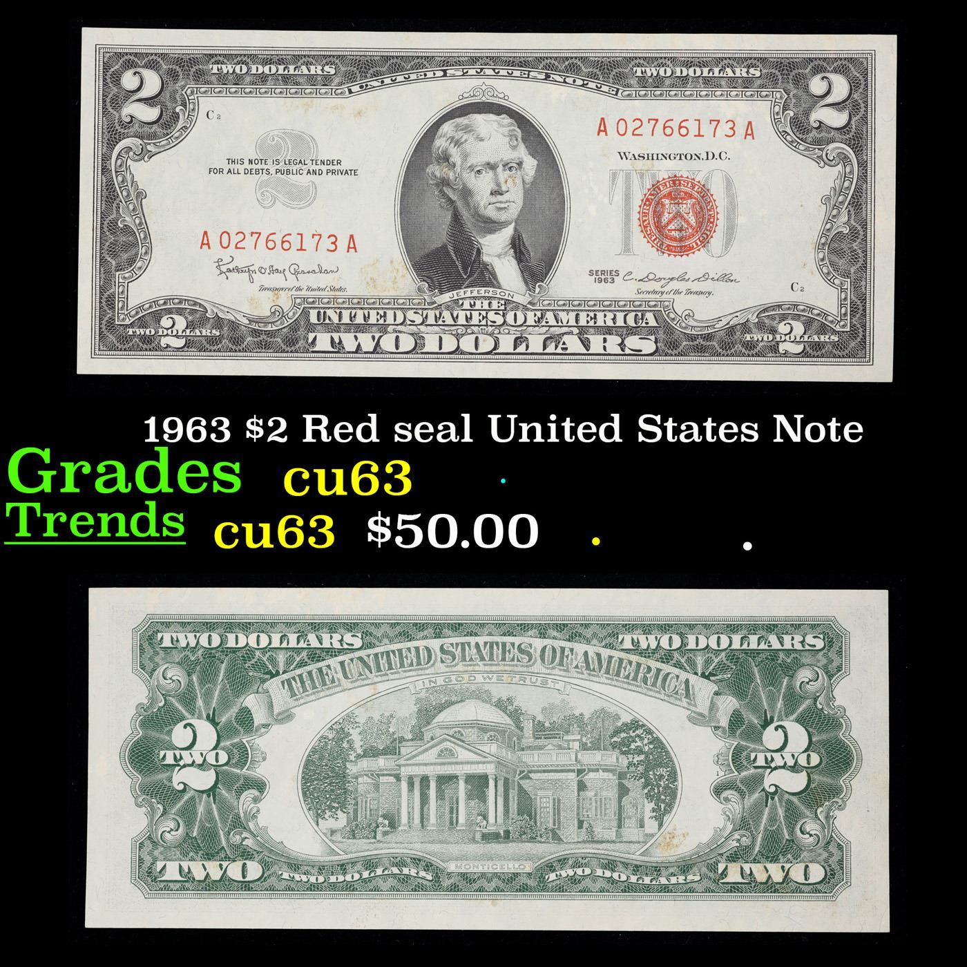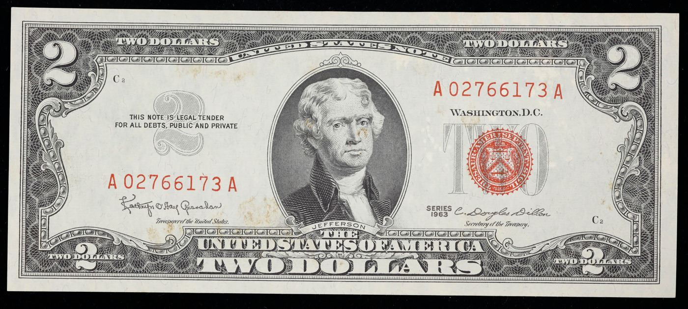 1963 $2 Red seal United States Note Grades Select CU. 1963 Legal Tender (United States Note). 1963 marks the last year that red seals were printed on two dollar bills. This is also the last year that Monticello was used on the back of two dollar bills. All two dollar bills from 1963 have a red seal on the right hand side of the bank note.