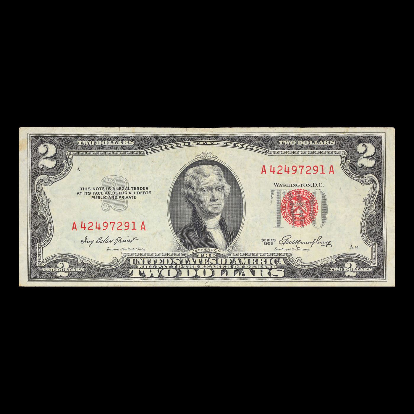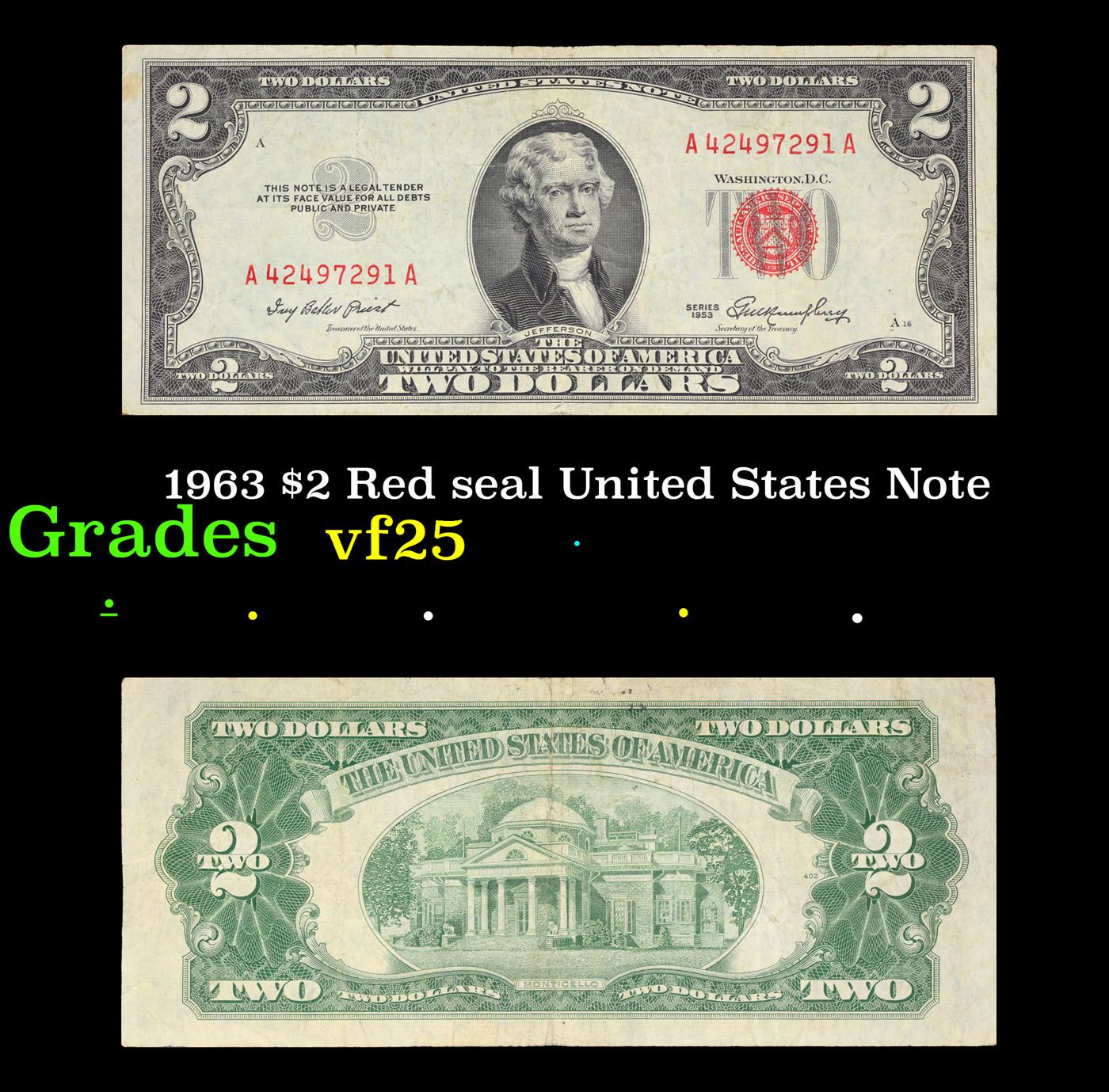 1963 $2 Red seal United States Note Grades vf+. 1963 Legal Tender (United States Note). 1963 marks the last year that red seals were printed on two dollar bills. This is also the last year that Monticello was used on the back of two dollar bills. All two dollar bills from 1963 have a red seal on the right hand side of the bank note.