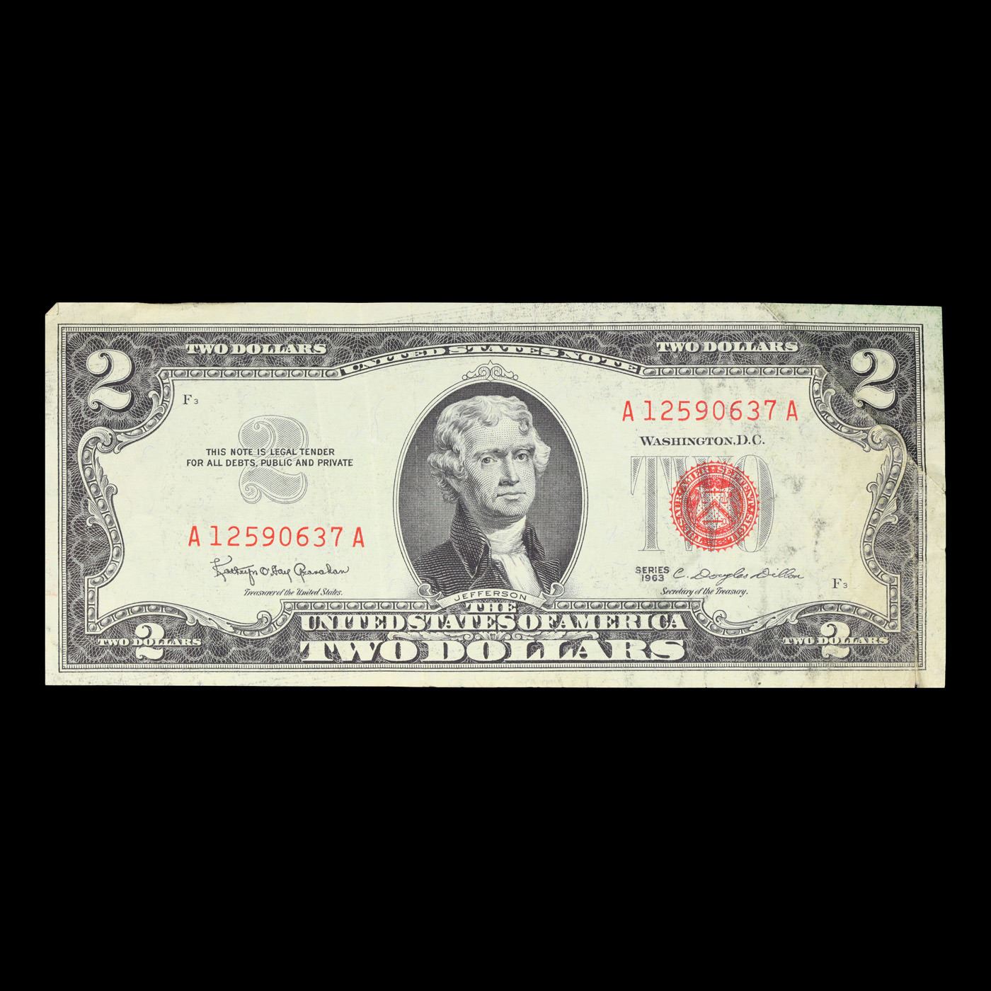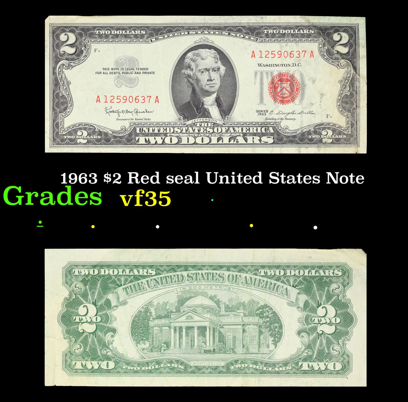 1963 $2 Red seal United States Note Grades vf++. 1963 Legal Tender (United States Note). 1963 marks the last year that red seals were printed on two dollar bills. This is also the last year that Monticello was used on the back of two dollar bills. All two dollar bills from 1963 have a red seal on the right hand side of the bank note.