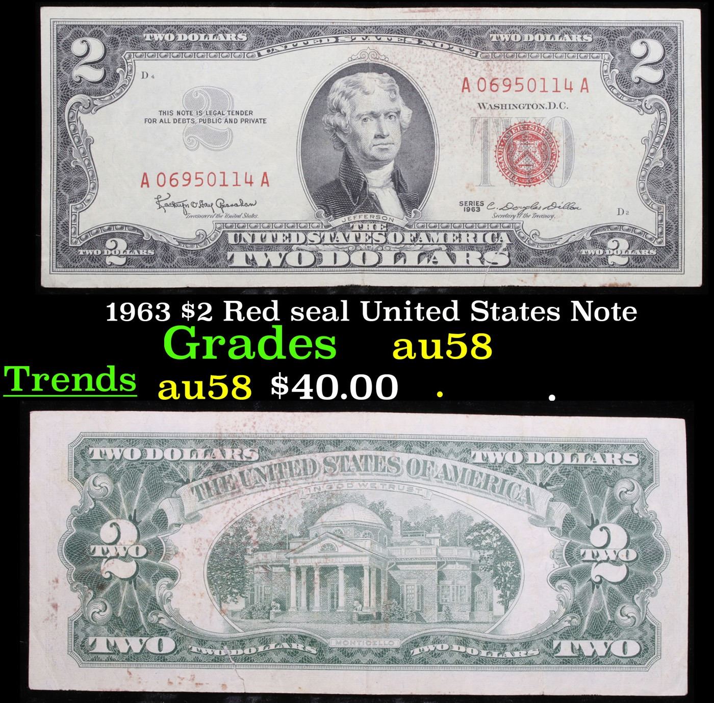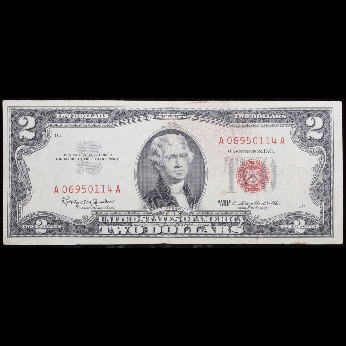 1963 $2 Red seal United States Note Grades xf. 1963 Legal Tender (United States Note). 1963 marks the last year that red seals were printed on two dollar bills. This is also the last year that Monticello was used on the back of two dollar bills. All two dollar bills from 1963 have a red seal on the right hand side of the bank note.