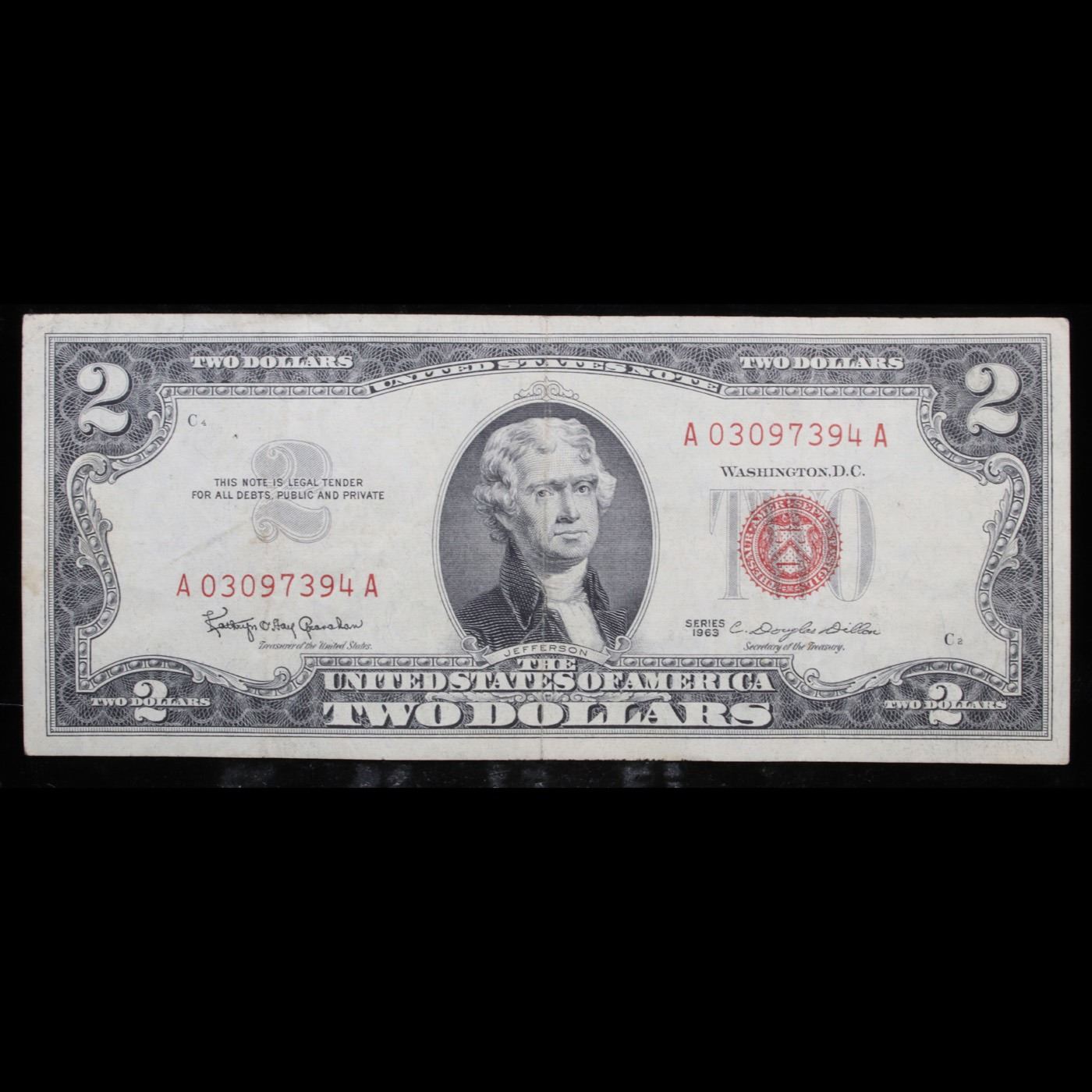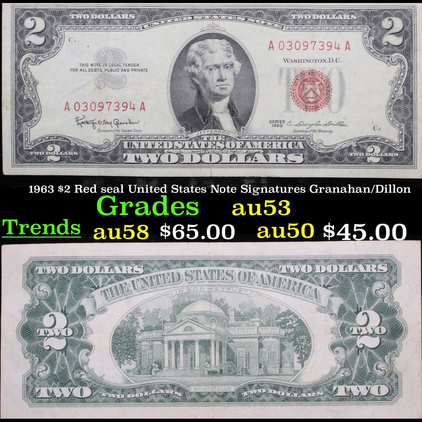 1963 $2 Red seal United States Note Signatures Granahan/Dillon Grades Select AU. 1963 Legal Tender (United States Note). 1963 marks the last year that red seals were printed on two dollar bills. This is also the last year that Monticello was used on the back of two dollar bills. All two dollar bills from 1963 have a red seal on the right hand side of the bank note.