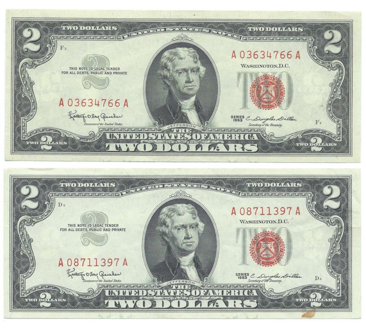 One 1963 $2 Uncirculated Red Seal Bill Lot of 2.