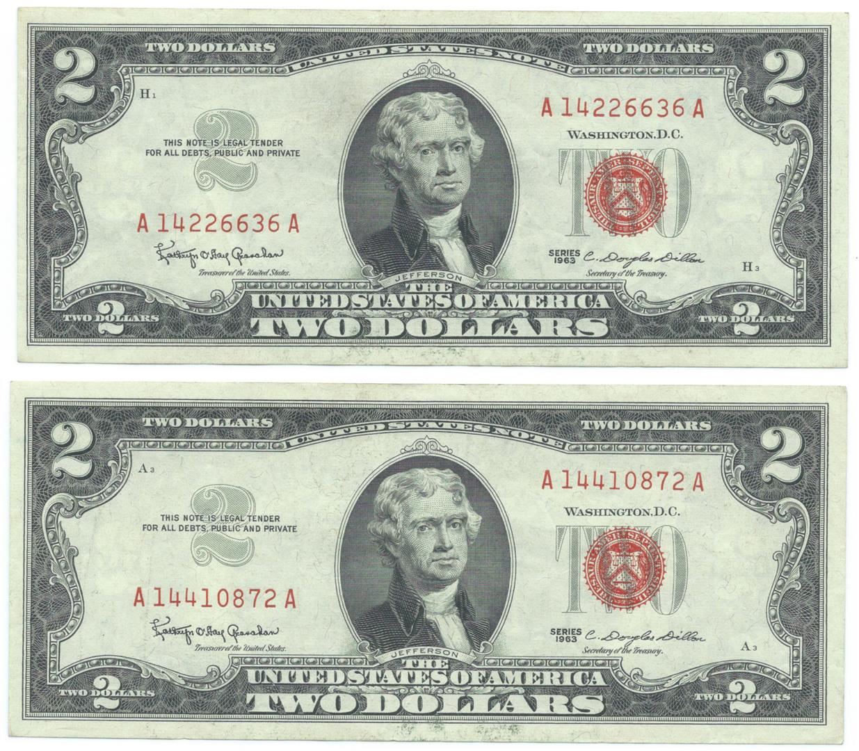One 1963 $2 Uncirculated Red Seal Bill Lot of 2.