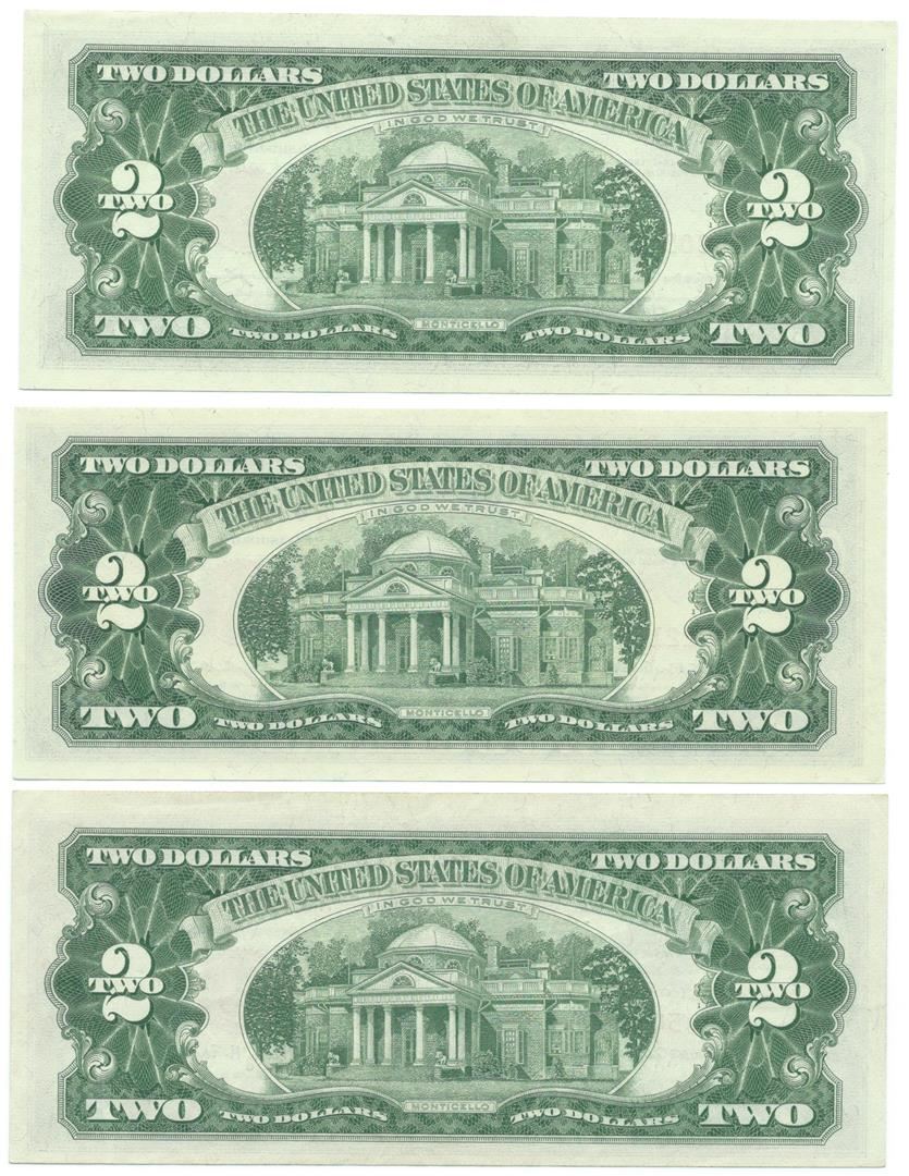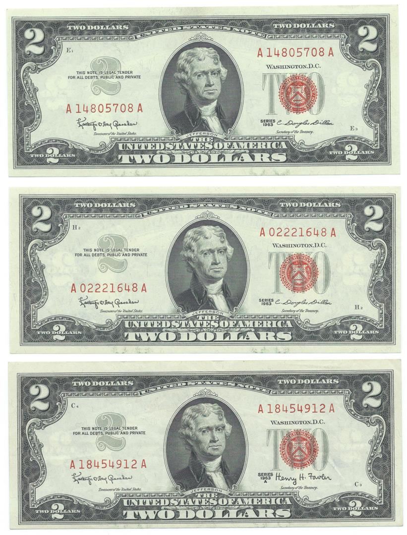 One 1963 $2 Uncirculated Red Seal Bill Lot of 3.