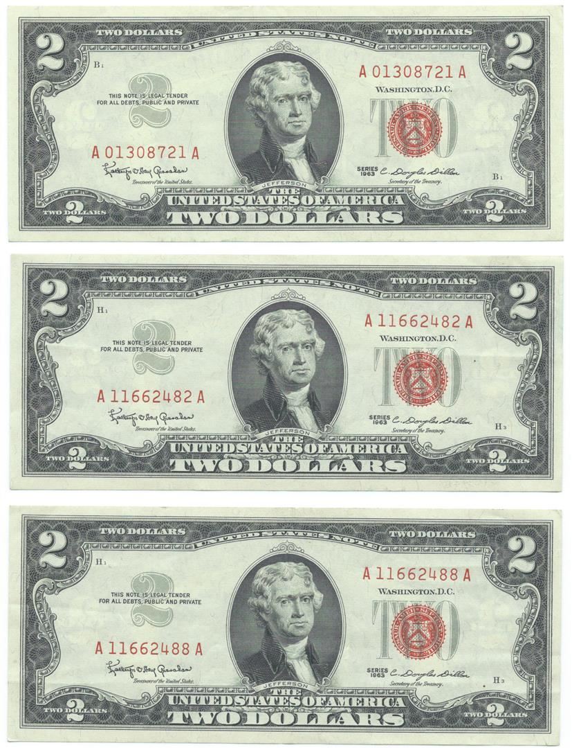 One 1963 $2 Uncirculated Red Seal Bill Lot of 3.