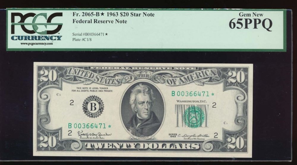 One 1963 $20 New York Federal Reserve Star Note PCGS 65PPQ.