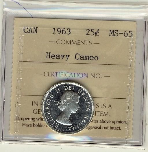 1963 25¢ ICCS MS65 HEAVY CAMEO, brilliant and lustrous.