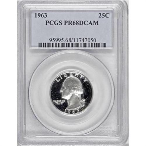 <B>1963 25C PR68 Deep Cameo PCGS.</B></I> PCGS Population (274/111). NGC Census: (254/93). Numismedia Wsl. Price for NGC/PCGS coin in PR68: $85. (#95995)<BR><BR><b>Shipping:</b> Coins & Currency (<a target="_blank" href="http://www.heritageauctions.com/common/shipping.php">view shipping information</a>)