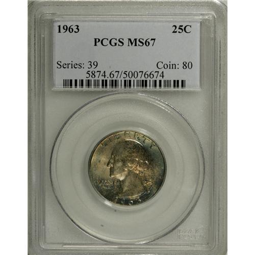 <B>1963 25C MS67 PCGS.</B></I> Splendid ocean-blue margins encompass golden-tinted centers. A satiny Superb Gem that possesses nearly pristine surfaces. The strike is unimprovable, and the eye appeal is exceptional. The 1963 is a common date, but is seldom found in such remarkable quality. Population: 7 in 67, 0 finer (1/07).<BR><BR><b>Shipping:</b> Coins & Currency (<a target="_blank" href="http://www.heritageauctions.com/common/shipping.php">view shipping information</a>)
