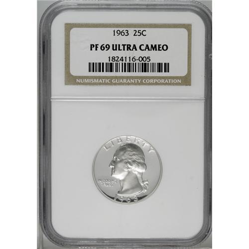 1963 25C PR69 Ultra Cameo NGC. Booming white frost on 1963[25C] PR69 Ultra Cameo NGC.