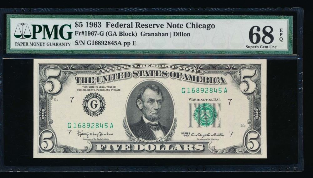 One 1963 $5 Chicago Federal Reserve Note PMG 68EPQ.
